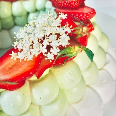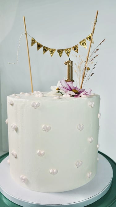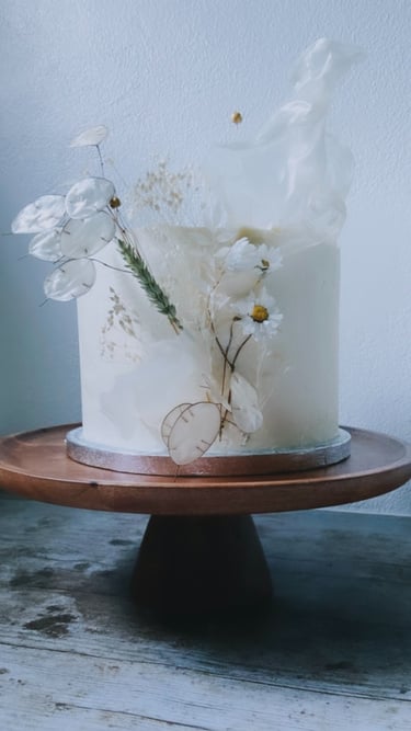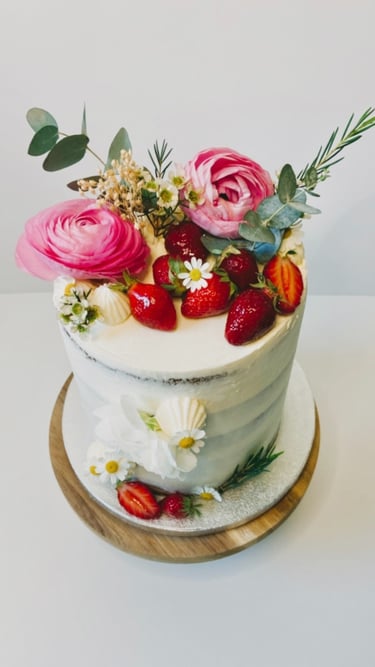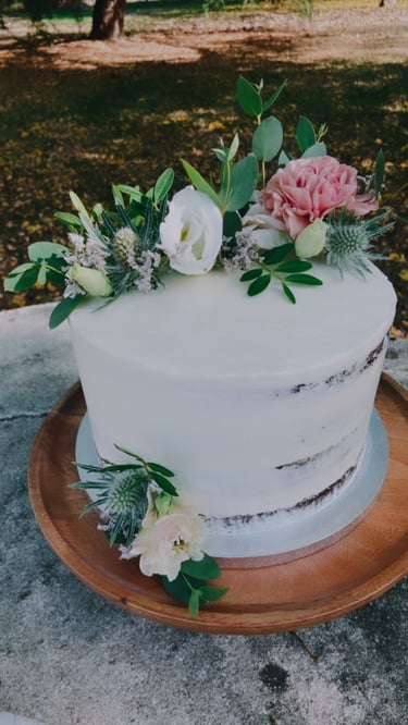 La décoration s'adapte à votre événement, elle est à base de crème, fruits, sablés, fleurs fraiches, végétaux, plantes aromatiques, perles en sucre, figurines etc... je ne réalise pas de modelages en pâte à sucre.