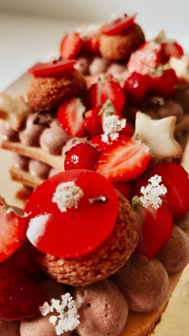 Sur une base de pâte sucrée ou de meringue je poche des crèmes et ganaches ou des choux retournés. La décoration est toujours à base de petits choux, meringues, fleurs comestibles, chocolats, fruits ou encore sablés.